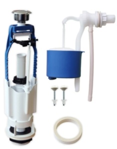 Комплект: наполнительный клапан КН 56.00.00 с пластиковым штуцером, выпускной клапан АС 105.00.00 с металлизированной или пластиковой кнопкой, комплект крепежа, прокладка между бачком и унитазом, паспорт-инструкция по установке.