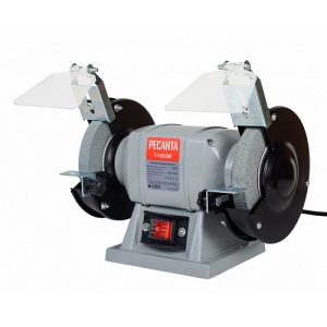 Точильный станок Ресанта предназначен для профессиональной заточки режущих поверхностей. Асинхронный электрический двигатель мощностью 200 Вт позволяет использовать его для ножей, стамесок, ножниц, зубил. Максимальная скорость вращения шлифовального круга равна 2950 об/мин. Это обеспечивает высокую производительность и быстроту заточки. Размер круга составляет 125х16 мм. Модель выпускается с двумя установленными шлифовальными кругами типа А36 для грубой обработки металла и А60 — для более тонкой. Их посадочный диаметр равен 12,7 мм.