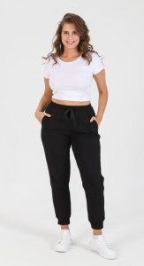 Брюки – длинные, на притачном поясе с эластичной тесьмой внутри и манжетами по низу. Передние половины – из двух частей каждая, со смещением соединительных швов в сторону боковых срезов. Соединительные швы передних половин с карманами. Пояс и манжеты выполнены из трикотажного полотна «кашкорсе».